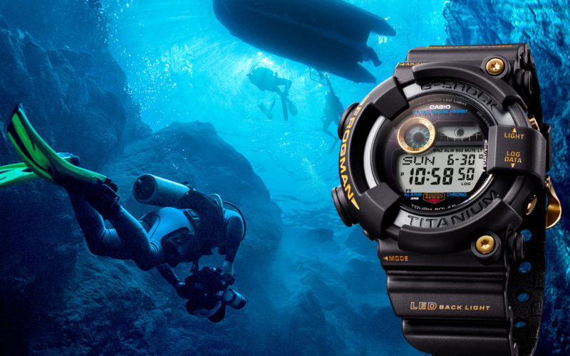 G-SHOCK蛙人錶Frogman系列30周年紀念錶GW-8230B,面盤的LED背光燈與錶背都有30周年限定蛙人圖案,點出此重要年分;內載Tough Solar太陽能充電系統,具潮汐與月相的功能,防水200米,讓佩戴者無需定期更換電池,能安心戴著從事各種戶外水上活動。