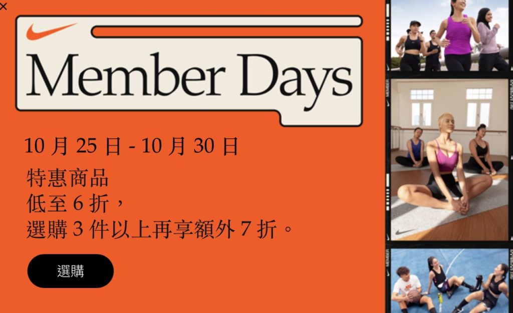 本次的「Member Day 」促銷時間為10 月 25 日到 10 月 30 日晚上 11:59,購買3件或更多列在特賣網頁上的產品,訂單即可享有額外7折優惠,也就是「折上折」。不少品項更已經先祭出優惠價格,舉例百搭款Nike Air Force 1,粉色系女鞋款式從原價4千元下殺到2,399元,若是使用代碼 MEMBER30 即可以 1,679元價位入手,現省下超過2千元。