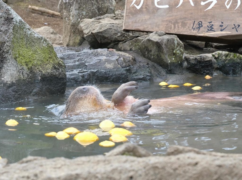 到了冬天,許多的動物園區若有水豚,都會舉辦「水豚泡柚子溫泉」的活動,吸引遊客進園欣賞萌萌的水豚舒服泡澡的模樣!