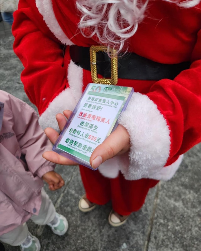 香港中華基督教青年會聯青聾人中心發文指,發現近日有人以中心名義,報稱是聾啞人士,裝扮成聖誕老人與遊人合照,並稱是以拍照謀生,向每名合影人收取30元。中心指該些人士展示的小卡是簡體字,澄清並非由中心發出,中心也不會使用簡體字,提醒市民切勿上當。