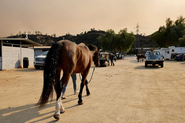 FILE PHOTO: An evacuated horse is exercised as large animals are evacuated from a number of wildfires, at the Los Angeles Equestrian Center in Burbank, California, U.S. January 8, 2025. REUTERS/Carlin Stiehl/File Photo