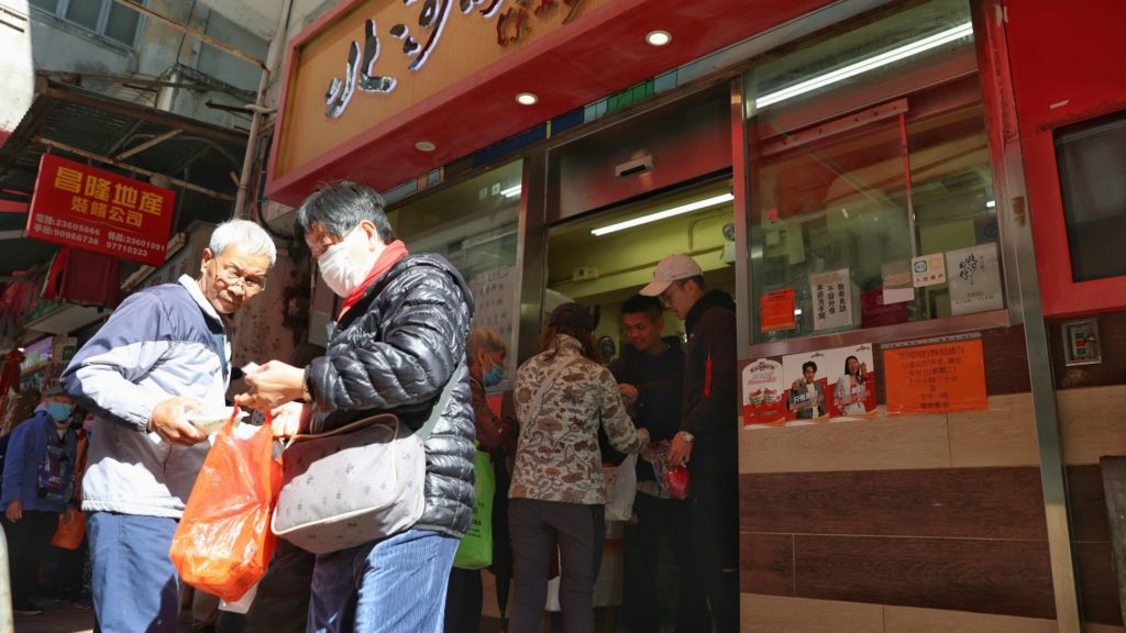 由明哥創辦的深水埗愛心飯堂「北河同行」,已連續超過10年派飯給基層長者。今早10時,餐廳外已聚集超過50名長者排隊。