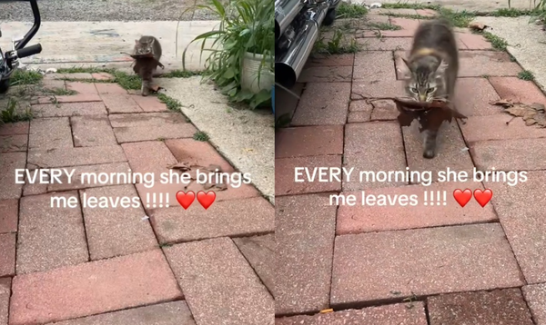 國外一名女主人分享,她每天都會讓所養的寵物貓出外散步,而貓咪回家時,為了向她表達愛意,口中每次都會叼著不同葉子作為禮物,讓她覺得非常暖心。可愛影片在網路上爆紅。