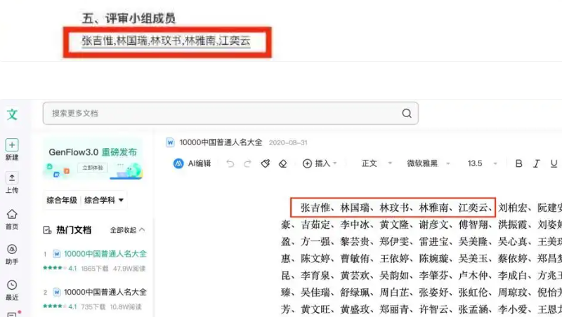 根據陸媒《瀟湘晨報》報導,有網友3日指出,該項目公告第五項中所列評審小組成員張吉惟、林國瑞、林玟書、林雅南、江奕云,與百度文庫「10000中國普通人名大全」前五個名字一致